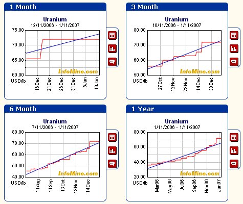 Laut "The Ux Consulting Co. LLC", die den wöchentlichen Spot-Preis für Uran auf ihrer Webseite veröffentlicht, wird zur Zeit das Pfund Uran zu 72 US-Dollar gehandelt.