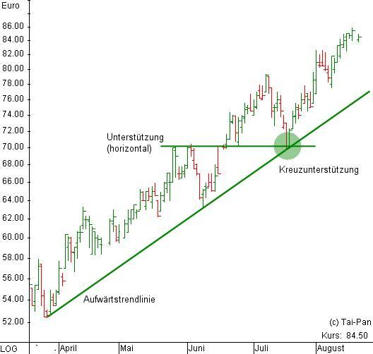 Eine Kreuzunterstützung entsteht, wenn sich eine Aufwärtstrendlinie und eine horizontale Unterstützungslinie schneiden.