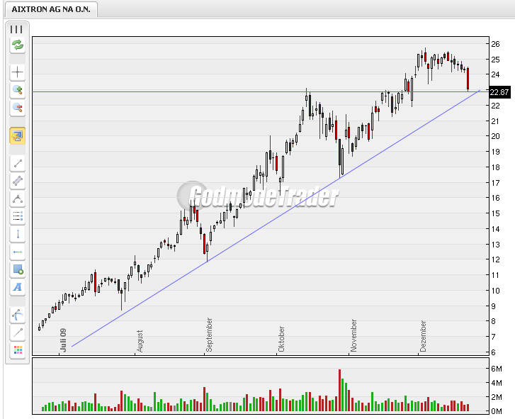22.12.2009 (www.4investors.de) - Mitten in der vorweihnachtlich ruhiger werdenden Börse schläft auch die Volatilität bei der Aixtron-Aktie immer mehr ein. Die Aktie ist im Konsolidierungsmodus, ohne groß Terrain preis zu geben. Die Seitwärtsbewegung läuft oberhalb von 23,62 Euro und in größten Teilen oberhalb von 24,11 Euro. Die übergeordnete Aufwärtsbewegung ist damit weiter intakt, prozyklische Verkaufssignale sind bislang ausgeblieben. Die abnehmende Volatilität deutet aber darauf hin, dass hier bald wieder stärkere Bewegungen passieren könnten.
