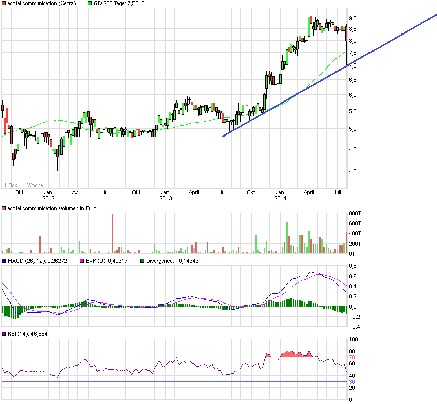 Ecotel war irgenwei auch prädestiniert für so eine Attacke von Kursdrückern. Bei 8,2 € die markante Chartunterstützung und marktenger Titel. Zudem ist der 1.August natürlich nochmal ein gefundenes Fressen, da bei allen Aktien die Monats-Ultimo-Orders aus den Orderbüchern verschwanden und somit das Xetra-Bid heute früh bei einigen nebenwerten richtig leer war. Da konnte man mit einer kleinen verkaufsorder eine echte SL Welle und Kurse 10-15% unter dem gestrigen auslösen. Ecotel war perfekt dafür.
