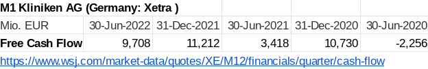 "Der Free Cashflow unter Berücksichtigung der Auszahlungen für Investitionen beträgt 19,0 Mio. Euro (Vorjahr 14,3 Mio. Euro)", https://www.eqs-news.com/de/news/corporate/m1-kliniken-ag-veroeffentlicht-vorlaeufige-zahlen-zum-geschaeftsjahr-2022/1799905