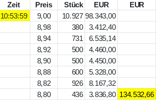 meine auswertung der sogenannten Tick-Daten auf xetra, https://www.boerse-frankfurt.de/aktie/m1-kliniken-ag/kurshistorie/tickdaten, hat ergeben, dass der heutige xetra-umsatz (bis 14:06: 673.011 EUR, https://www.finanznachrichten.de/aktienkurse-boersen/m1-kliniken-ag.htm) zu 86% auf preisblöcke (derselben sekunde) von > 10.000 EUR entfiel, beispiel in der tabelle unten