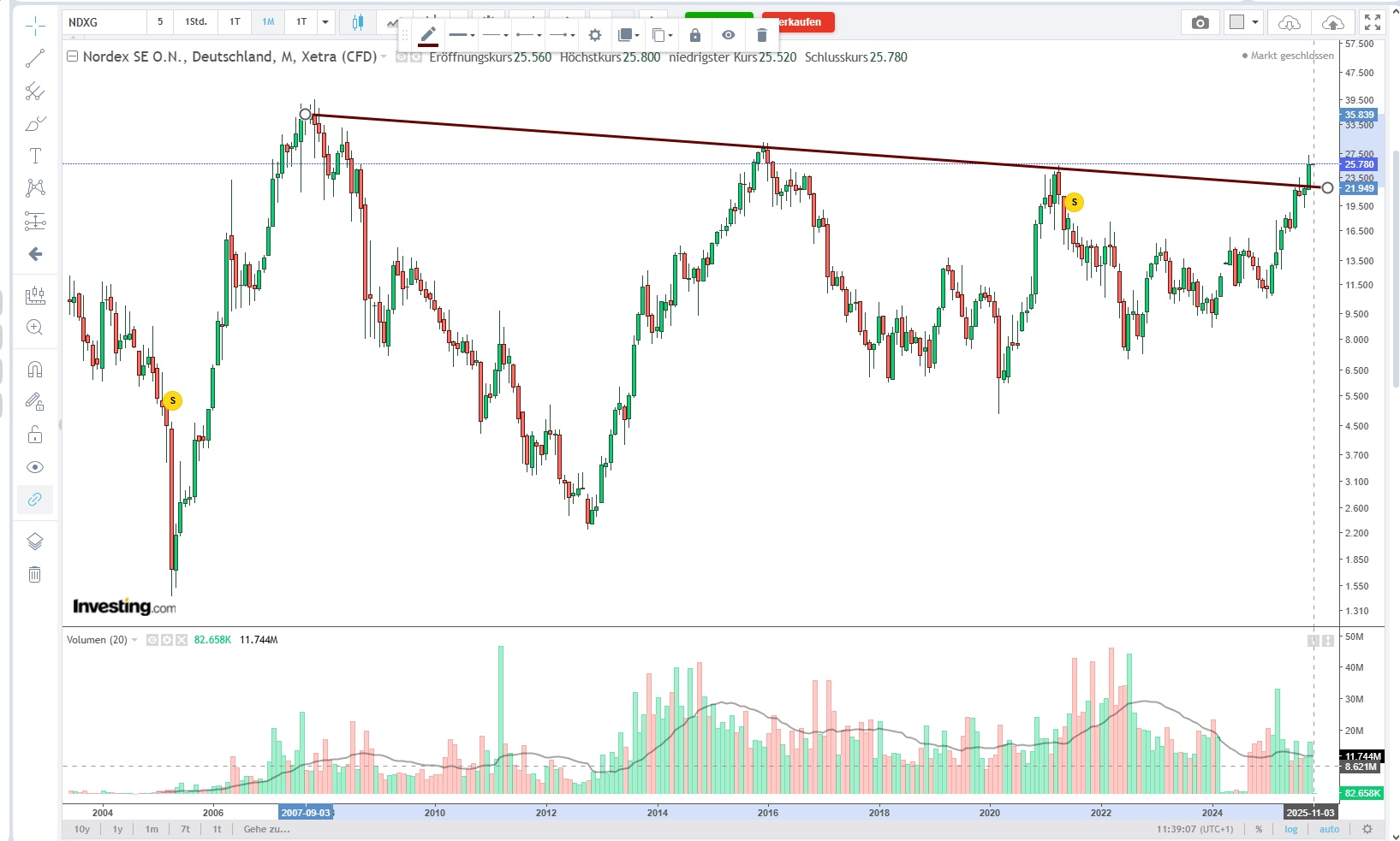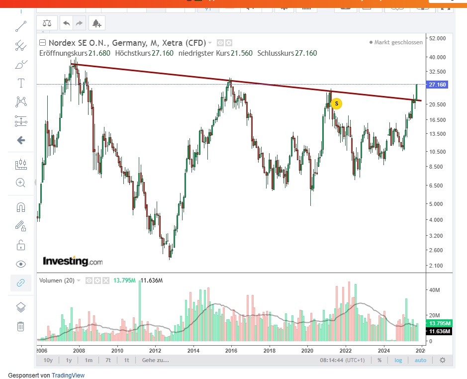 Das Gleiche jetzt bei Nordex , Letzte Woche fällt unter 22€ um circa 4% danach stieg im circa 20€ auf 27€.