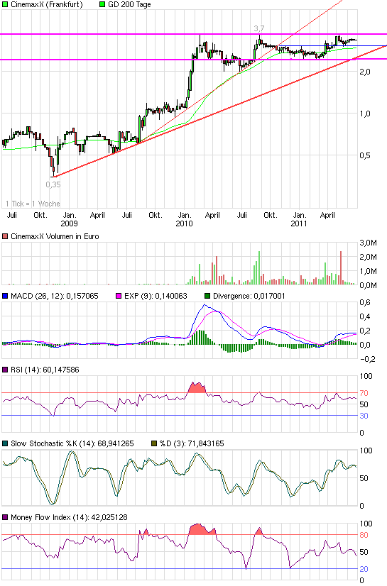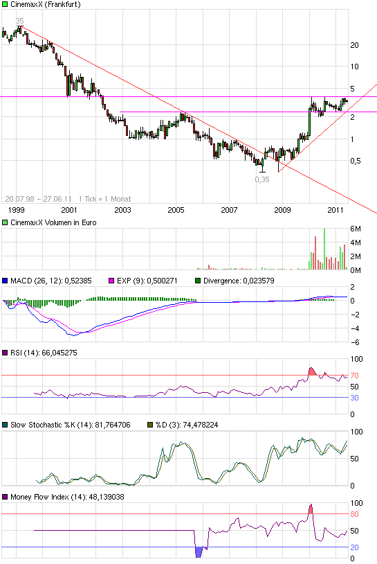 Für das laufende Geschäftsjahr erwartet CinemaxX auf Konzernebene einen Besucherzuwachs und damit erneut ein positives operatives (Vorsteuer-) Ergebnis - in etwa auf dem Niveau des Jahres 2010. Angesichts der rund 40 3-D-Filme, die 2011 auf die Leinwand kommen, eine recht konservative Annahme. Umso dynamischer könnte die Kursreaktion Richtung Norden ausfallen, wenn Cinemaxx mit seinen Halbjahreszahlen am 18. August positiv überraschen sollte. Die Bewertung lässt jedenfalls noch genügend Luft nach oben. Das 2012er-KGV liegt bei 8,4, dass Kurs-Umsatz-Verhältnis bei 0,42.