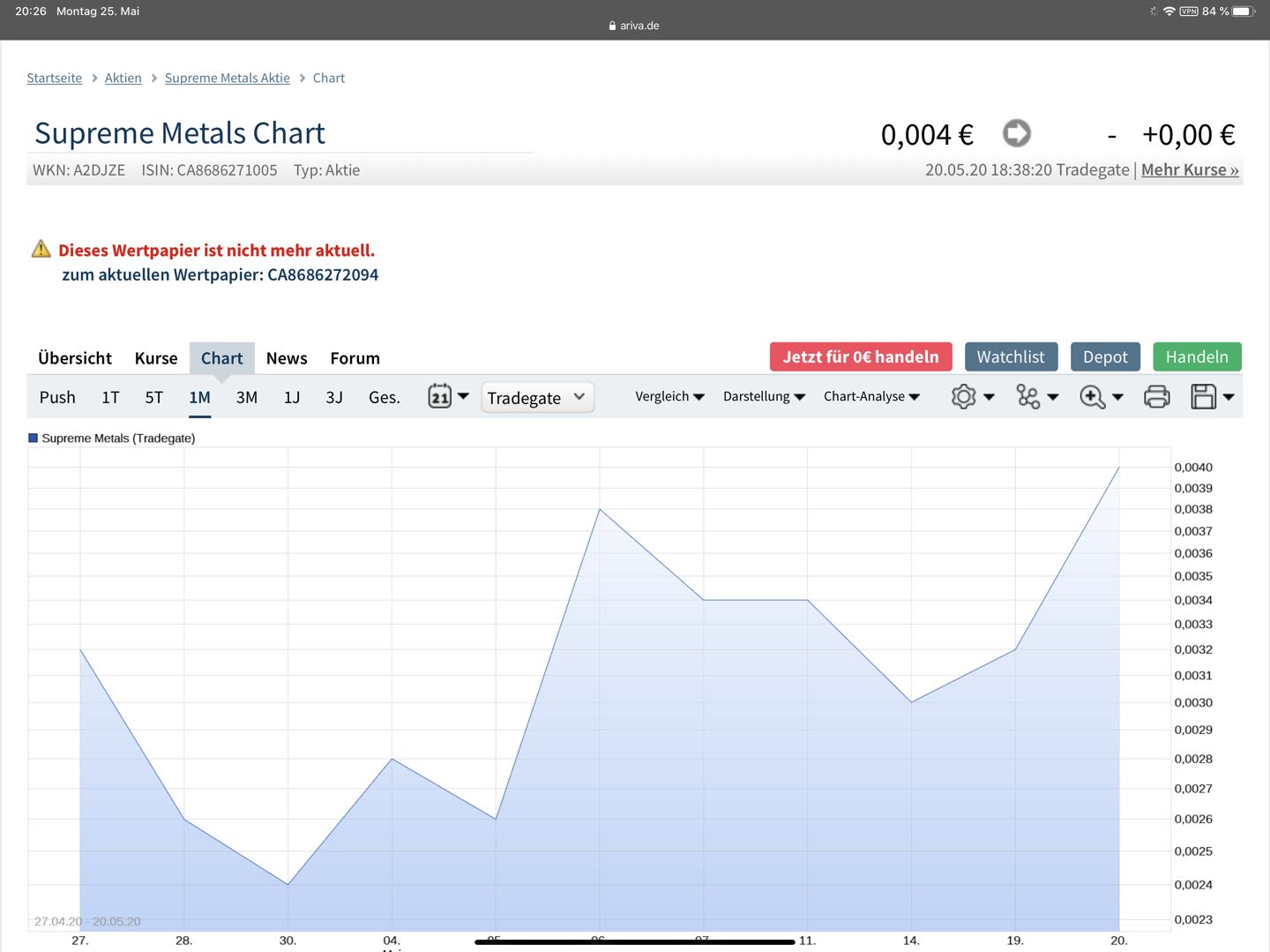 ich bin hier mal aktiv ins Forum eingestiegen, nachdem ich jahrelang nur stiller Leser war. Nach telefonischer Rücksprache heute Morgen mit meinem Banker, sieht es so aus, als wenn Supreme Metals hier einen Aktientausch vollzogen hat. Alte WKN/ ISIN: A2DJZE/ CA8686271005 Neue WKN/ISIN: A2P46M/ CA8686272094 Die Supreme Metals werden wohl 1:20 getauscht. Ich hatte (habe) 100000 Stück alte WKN/ ISIN und die werden wohl zu 5000 Stück unter der neuen Kennung getauscht. Ich hatte die Aktien eigentlich schon als Totalverlust abgeschrieben und sie dümpelten nur noch im Depot vor sich hin. Nun gibt es zumindest mal wieder einen nennbaren Wert. Info zunächst nur unter Vorbehalt und noch nicht verbindlich recherchiert. Bin mal gespannt wie es weiter geht.