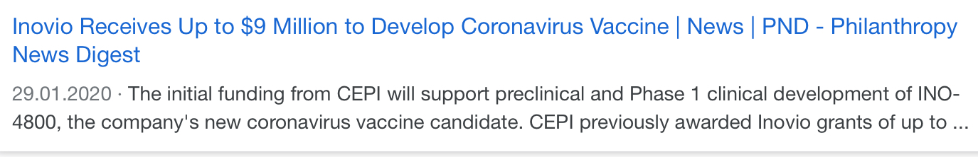 Der Zuschuss für Inovio kommt von der Coalition for Epidemic Preparedness Innovations (CEPI), einer Partnerschaft, die Geld von öffentlichen und privaten Gruppen, einschließlich der Bill & Melinda Gates Foundation, erhält.