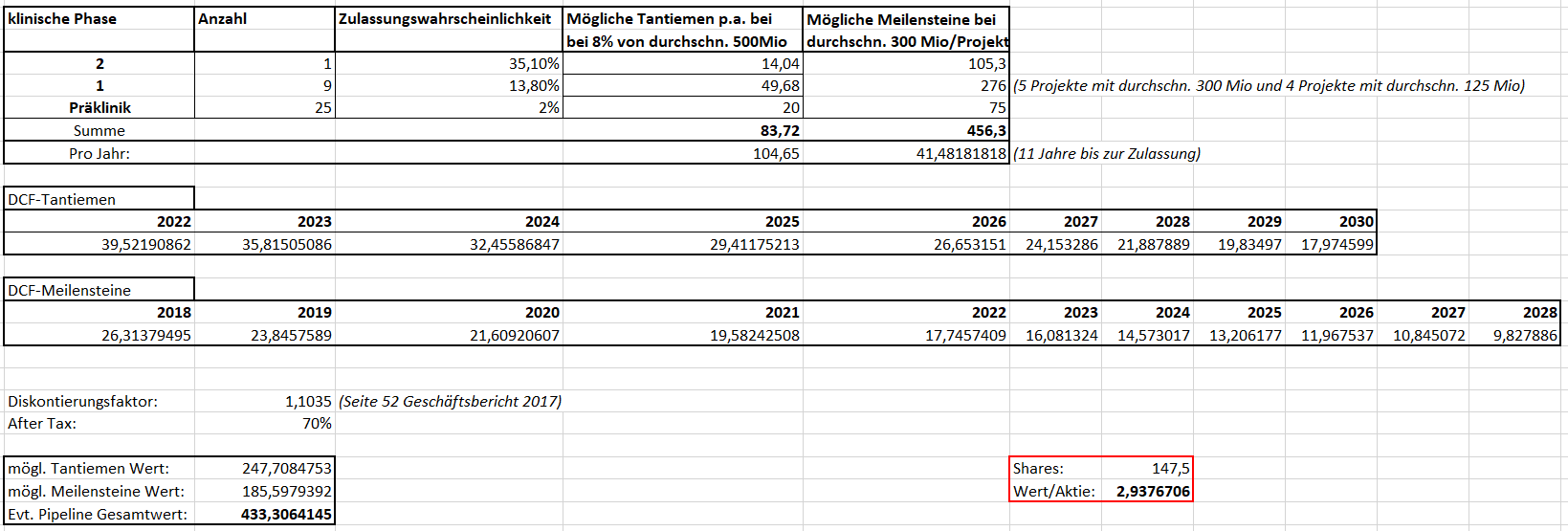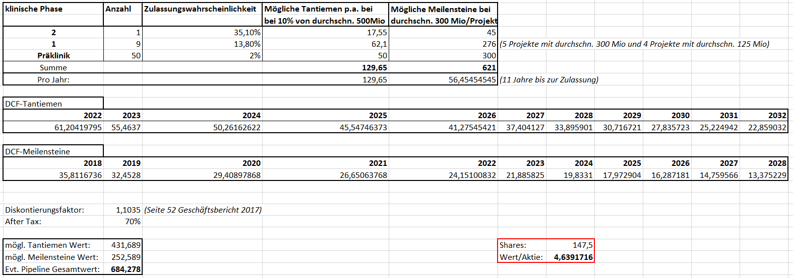 Nach ein par weiteren Verbesserungen von Fehlern und Ungenauigkeiten im Modell komme ich jetzt auf einen Pipelinewert ab Präklinik von circa. 2,94€/Share. Das ist denke ich eine relativ realistische Annahme, da wie schon gesagt die Pipeline noch in sehr frühem Stadium ist. Desweiteren wird in meinem Modell von konservativen 500 Mio. Umsatzpotential der Produkte ausgegangen, das ist meiner Meinung nach die absolute Untergrenze und bietet noch viel Spielraum nach oben. Außerdem werden in meinem Modell die >50 Projekte in der Forschung überhaupt nicht berücksichtigt, was natürlich auch ein Ungenauigkeitsfaktor ist.