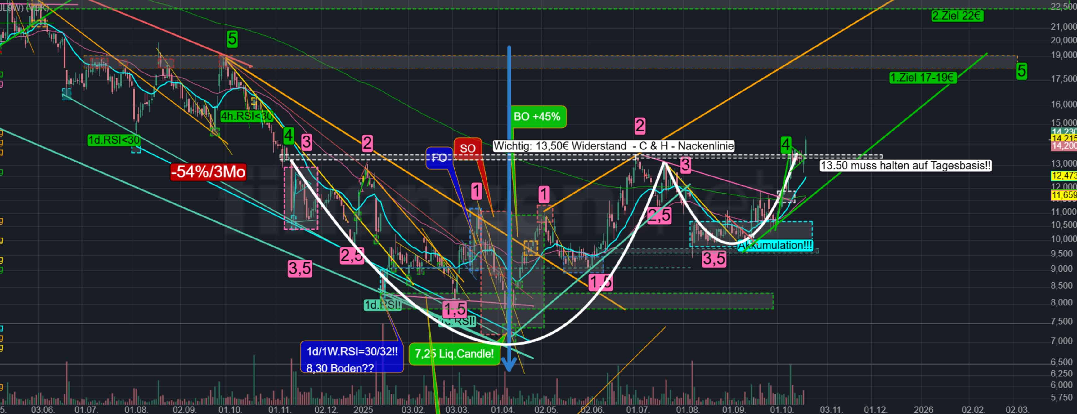 Der Chart sagt, dass wenn die 13.50€ auf Tagesschlusskursbasis auch morgen noch hält, dann gehts in den Bereich bis 17-19€.