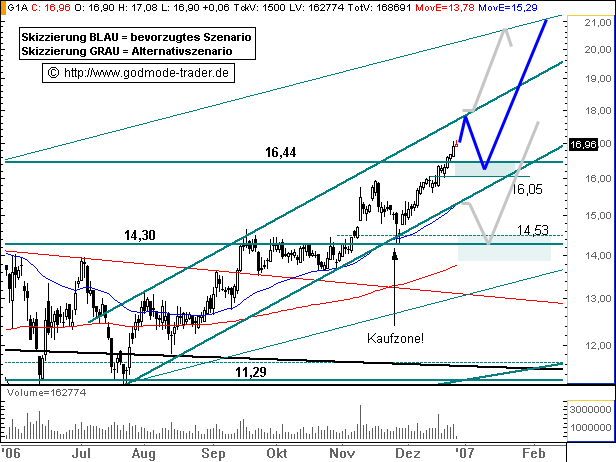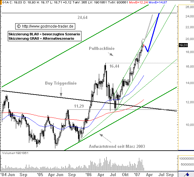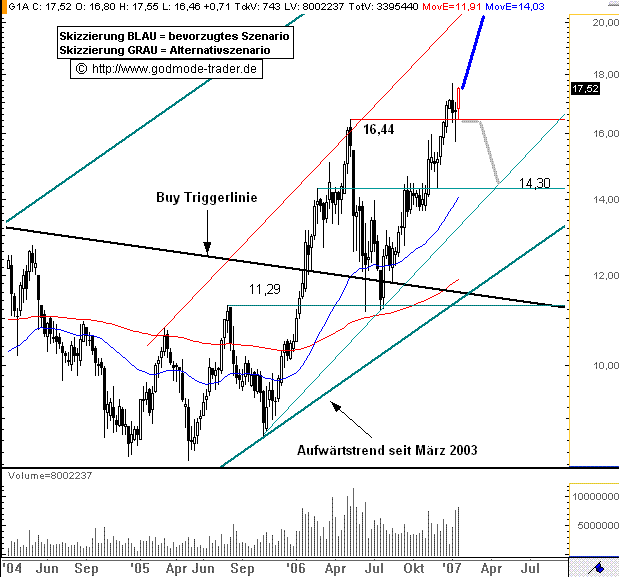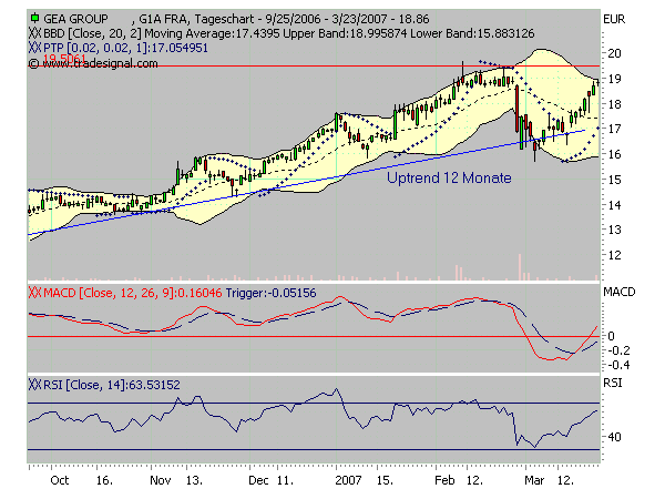 Rückblick: Die Aktie der GEA GROUP befindet sich seit einem Tief bei 4,87 Euro im März 2003 in einer langfristigen Aufwärtsbewegung. Innerhalb dieser Bewegung löste die Aktie im Januar 2006 eine langfristige BUY Triggerlinie aus. Dadurch kam es zu einem wichtigen Kaufsignal mit Ziel bei 24,64 Euro. Nach einem Zwischenhoch bei 16,44 Euro im Mai 2006 fiel die Aktie auf die Unterstützung bei 11,25 Euro zurück. Von dort aus zieht die Aktie seit Mitte Juli 2006 in einer mittelfristigen Aufwärtsbewegung an. In der vorletzten Woche notierte die Aktie sogar kurzzeitig über der oberen Begrenzung bei aktuell 19,88 Euro. Allerdings fiel die Aktie inzwischen wieder darunter zurück.