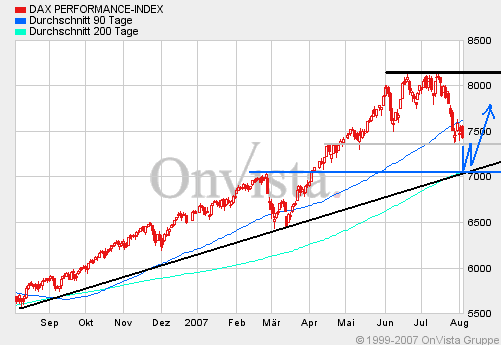 'Im Moment ist es extrem schwer einzuschätzen, wohin der DAX laufen könnte', sagte Stratege Michael Köhler von der LBBW. 'Im Falle weiterer negativer Nachrichten zum subprime-Markt dürfte es kräftig abwärts gehen. Bleiben sie aus, sollten wir nächste Woche eine Erholung sehen', glaubt er. Seine Hoffnung liegt dabei auf den neuen Quartalsberichten, nachdem die bislang vorgelegten zwar nicht an das 'überragende erste Quartal' hätten anknüpfen können, aber dennoch 'weitgehend überzeugend' gewesen seien. Auch die Experten der Landesbank Berlin sind vorsichtig: 'Trotz der begonnenen Stabilisierung um die Marke von 7.400 Punkten in den letzten Tagen muss die aktuelle Kursschwäche noch nicht zwingend beendet sein', heißt es dort. 'Die Marktteilnehmer werden weiterhin sehr sensibel auf die Nachrichten aus dem Immoblien- und Finanzsektor reagieren, womit sich die hoch volatile Börsenphase zunächst weiter fortsetzen dürfte.'