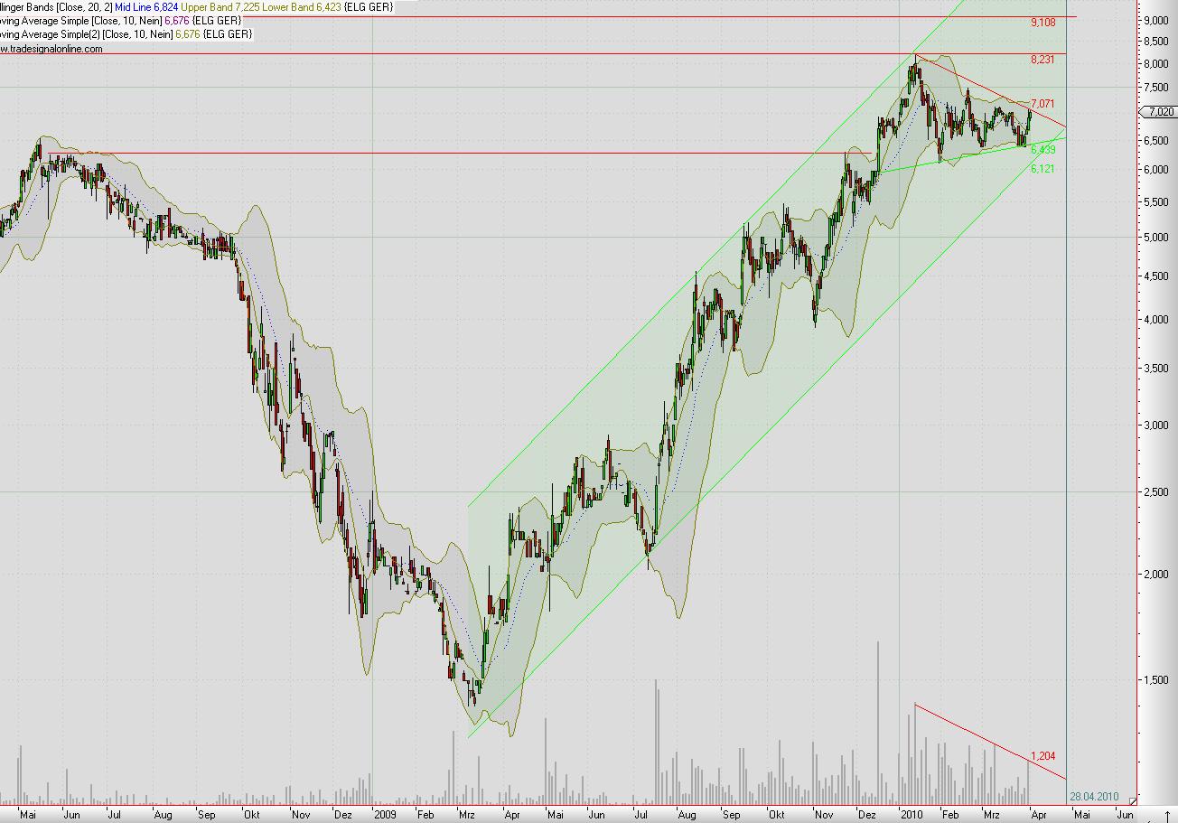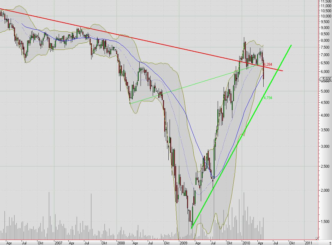 habe tatsächlich noch eine aufwärtstrendlinie gefunden die noch nicht gebrochen ist. frankfurt wocheschluss liegt bei 5,45. das ist über 10 % außerhalb des wochenbollingers. müsste eigentlich mit ziemlicher sicherheit einen kurzen rebound über 6 eur geben. sollte man sich von elmos nachhaltige kurssteigerungen erhoffen sollte der kurs möglichst schnell wieder über den seit 2005 existierenden übergeordneten abwärtstrend kommen (6,30).