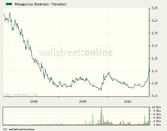 Die momentane Produktion des letzten Quartals liegt bei rund 20 000 Unzen Gold, ein Produktionsziel von 100 000 Unzen Gold jährlich sollte schon sehr bald erreicht sein. Die Produktionskosten werden kontinuierlich gesenkt und lagen im November bei nur noch 557 Dollar je produzierter Feinunze. Momentan wird eine 30 Mio. Dollar schwere Kapitalerhöhung durchgeführt, welche in den nächsten Tagen abgeschlossen sein sollte. Durch diese Finanzspritze ist Petaquilla Minerals schuldenfrei. Weitere Details erfahren Sie hier: http://www.petaquilla.com/news/pdf/corp_pre_2010.pdf