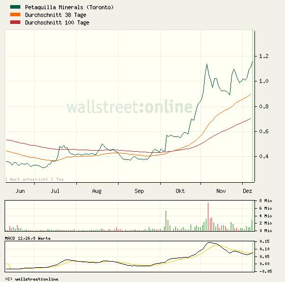 Bei aktuell 125,28 Millionen ausstehenden Aktien sowie einem aktuellen Kurs von 0,92 USD (bzw. 0,65 Euro) beträgt die Marktkapitalisierung von Petaquilla Minerals lediglich 115 Millionen USD. Bei einem zu erwartenden Nettogewinn von rund 40 Millionen USD im kommenden Geschäftsjahr (1.6.2011 bis 31.5.2012) lässt sich daraus ein überaus günstiges Kurs-Gewinn-Verhältnis von 2,87 errechnen, was Petaquilla Minerals nicht nur zur günstigsten Goldaktie weltweit macht, sondern der Aktie auch entsprechendes Aufwärtspotential einräumt.