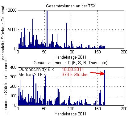 Auffällig ist das Volumen in Deutschland gestern und heute. Wenn man alle vier deutsche Handelsplätze (Frankfurt, Stuttgart, Berlin und Tradegate) zusammen nimmt, war gestern der Tag mit dem höchsten Volumen des Jahres! Fast alles Käufe aus dem Ask und das bei einem Donnerwetter von -6 % im DAX. Woher kommt diese Kaufwut auf einmal? In Kanada war kein außergewöhnlich hohes Volumen festzstellen.