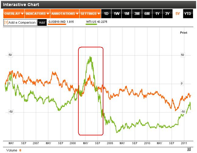 Im Normalfall nicht, für einen scharfen Anstieg des Ölpreis habe ich allerdings etwas gefunden: als im Mai 2008 der Ölpreis ansetzte auf 150$ zu steigen, stieg auch die japanische Rendite der 10jährigen Staatsanleihen nachdem sie zuvor fast 1 Jahr gefallen war. Parallel dazu (nicht im Bild) stieg USD/JPY um 10% von 100 auf 110.