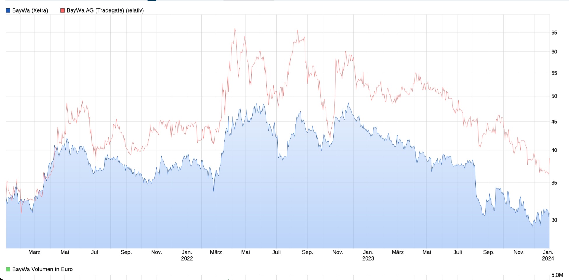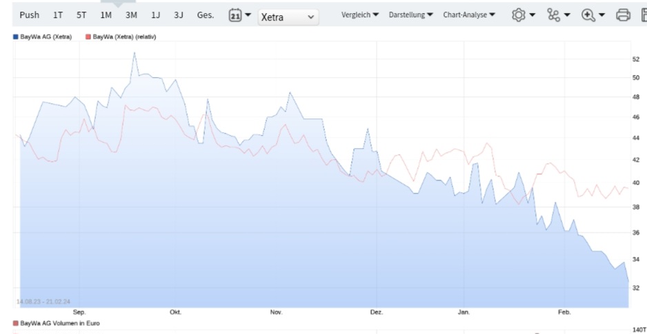 - Heute Schluss auf Tageshoch. Allein eine technische Erholung sollte schon bis knapp 26 gehen. Und damit hätte die MK sich gegenüber den in 2022 erreichten Werten immer noch fast halbiert. Die werden zwar wohl erst mal nicht wieder erreicht. Aber so breit wie Baywa aufgestellt ist, eine Menge Aufwärtspotenzial könnte man hier schon erwarten.