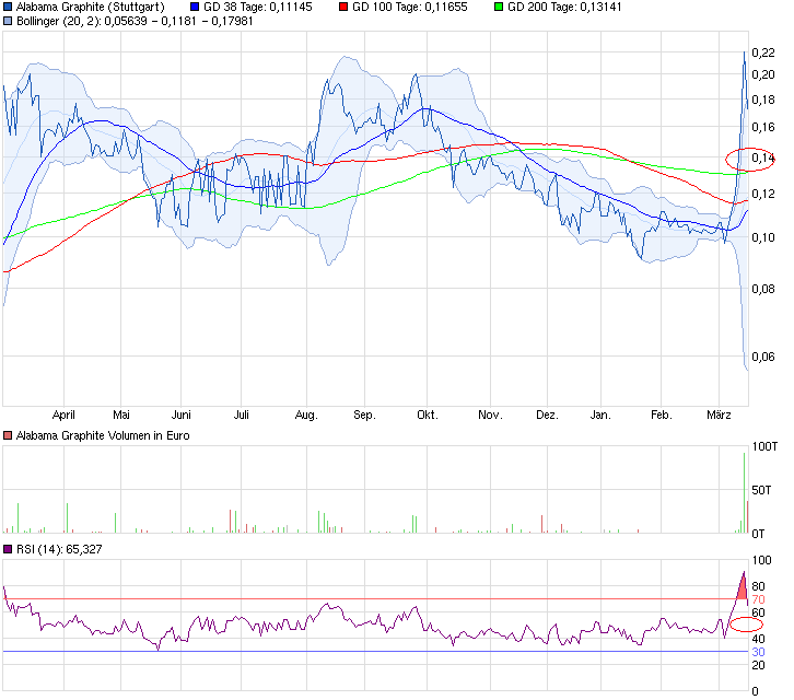 Die Aktie von Alabama Graphite (WKN A1J35M) steigt seit einigen Tagen massiv an. In nur vier Handelstagen ist die Aktie des fortgeschrittenen Graphitexplorers an der Heimatbörse in Toronto (TSX-V) von 0,14 auf 0,18$ (CDN) gestiegen. Wir haben gestern den CEO Ron Roda gesprochen und meinen, dass man die Aktie jetzt kaufen sollte.