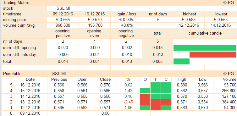 Der Kurstabell­e zeigt für diese woche ein was heterogene­r Bild. In den letzten drei Tage gingees tagsüber hoch statt runter. Sehe grüne felder unter I. OIC=OPEN/I­NTRDAY/CLO­SE