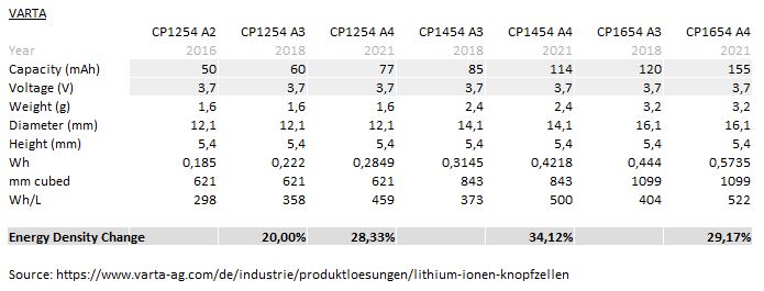 Wie in dem Chart Thread geschrieben bietet VARTA mit der A4 Generation ca. 30% mehr Leistung gegenüber die Gen. A3 im gleichen Format oder vergleichbare Leistung in einem kleineren Format. (CP1454 hat zB. einen Durchmesser von ca. 14mm und eine Höhe von 5,4mm, CP1254 2mm weniger)