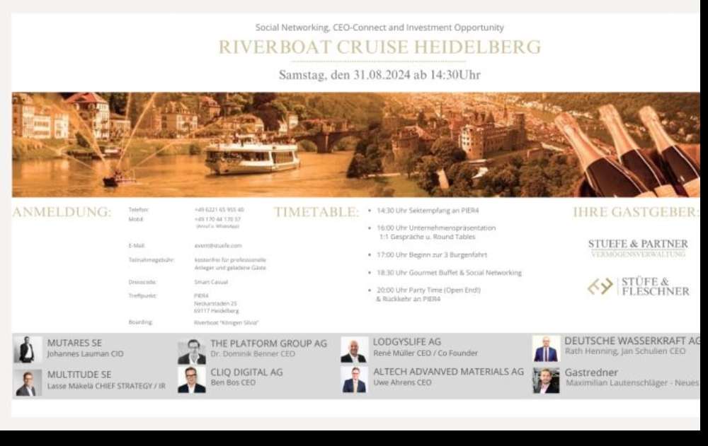 Am morgigen Samstag wird man sich in Heidelberg erstmals vor ausgewählten Investoren auf dem Riverboat präsentieren - ein Meilenstein, wenn ich an die vergangenen gut 10 Jahre zurück denke, seit ich die Gesellschaft verfolge. Vielleicht können wir kommende Woche einige Informationen im Newsletter von boersengefluester.de nachlesen, der über die Veranstaltung berichten will.