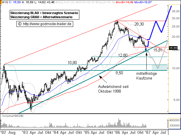 Rückblick: Die Aktie des südkoreanischen Automobilherstellers HYUNDAI befindet sich seit 1998 in einer Aufwärtsbewegung, welche die Altie auf ein Allzeithoch bei 28,50 Euro ansteigen ließ. Dort startete im Januar 2006 eine Korrekturbewegung, welche aktuell die Kreuzunterstützung aus primärem Aufwärtstrend und exp. GDL 200 (EMA200) bei 14,48 - 14,65 Euro erreicht. Hier prallt die Aktie zunächst wieder nach oben hin ab. Das kurzfristige Chartbild ist neutral zu werten, das mittelfristige weiter bullisch, so lange die genannte Kreuzunterstützung verteidigt wird.