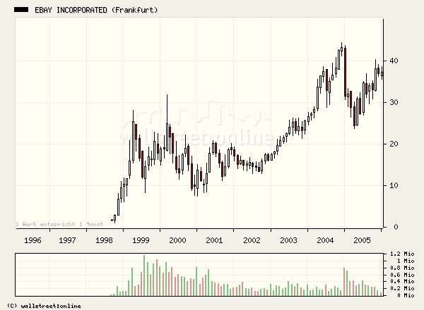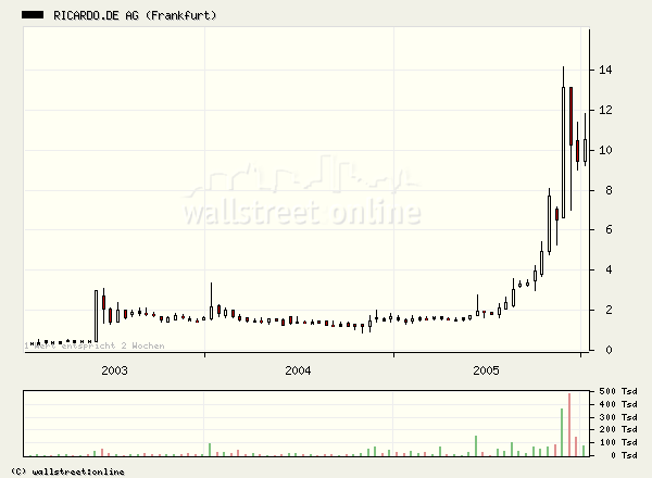 Eine der bestgelaufenen Aktien des vergangenen Jahres war Ricardo.de - gleichfalls eine Auktionsplattform. Am Freitag, dem 9. Dezember erreichte die Aufwärtsentwicklung ihren vorläufigen Höhepunkt, seitdem schwächelt das Papier. Am darauffolgenden Dienstag begann, wenngleich zunächst verhalten, der Aufstieg der Abacho-Aktie. Es liegt auf der Hand zu vermuten, daß hier Umschichtungen stattgefunden haben und womöglich noch stattfinden. Ist dies der Fall, so steht zu befürchten, daß sich die derzeitigen Käufer im Falle eines Falles ebenso rasch einem neuen Favoriten zuwenden - mit entsprechenden Konsequenzen für den Kurs.10-16 EURO