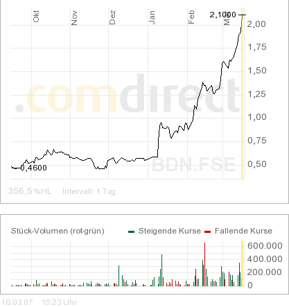 Wie soros schon schrieb nimmt das Volumen immer mehr zu und in den nächsten zwei Wochen sehen wir dann mal so richtige Kurssprünge.Ich glaube Broadi hat von sich Reden gemacht und das einzigste warum die Umsätze noch relativ gering sind, ist die Tatsache, dass viele Leute denken, dass Broadi doch mal langsam korregieren muß bevor man da einsteigt, aber NEIN, Broadi korregiert einfach nicht und die Leutchen stehen auf heisse Kohlen, sie wollen aber können NOCH nicht.