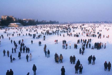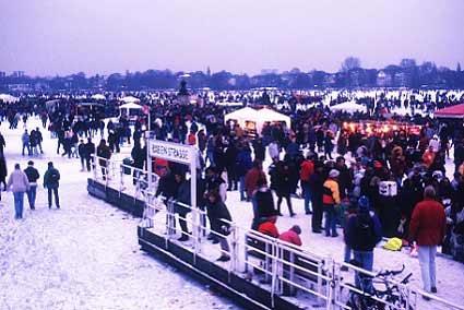 die Außenalster zugefroren ist, gibt's gleich ein Riesenspektakel. Das nennt sich "Winter-Alstervergnügen", letztmalig 1998. Da werden dann ruckzuck und unbürokratisch die Genehmigungen für Buden und Schausteller erteilt, die sich in Ufernähe auf dem Eis platzieren. Bis zu 1 Mio. Menschen tummeln sich auf dem Eis, es wird Eishockey gespiel, Schlittschuh gelaufen oder gerodelt, Musik gehört und Glühwein getrunken. Die Fläche wird ständig mit Bohrungen überprüft. Einmal wurd's ganz schön knapp, da kreisten Hubschrauber über der Alster und die Menschen wurden mit Megaphone aufgefordert, umgehend das Eis zu verlassen, da es schon leicht anfing zu tauen.