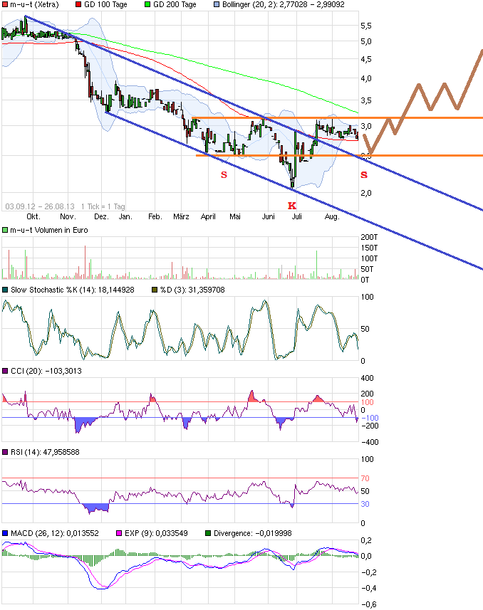 Wirklich prozyklische Investoren warten aber normalerweise den Bruch der 3,15 ab. Dann wäre erst ein Aufwärtstrend etabliert. Bislang seh ich es nach dem Ausbruch als Seitwärtsbewegung zwischen 2,70 und 3,15 €.