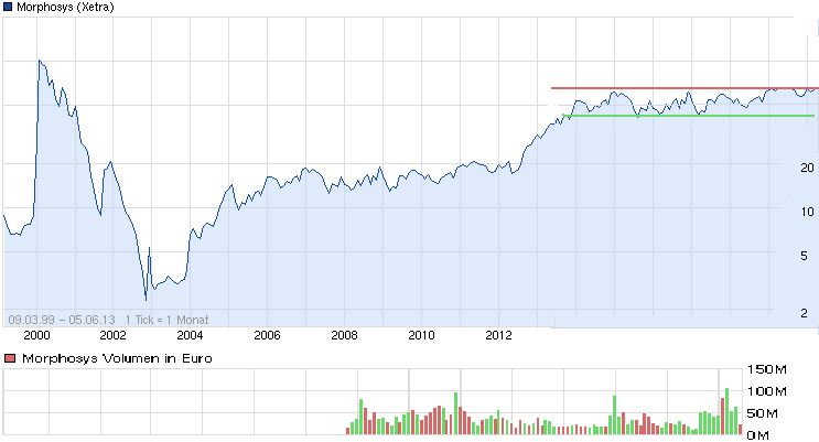 Ein führendes Partnerprojekt ist Gantenerumab von Roche gegen Alzheimer. Bei positiver Zwischenauswertung kann alleine dieses Programm weitere satte Kurssprünge auslösen. Weitere fortgeschrittene Projekte mit Chancen auf P3-Studien in den nächsten 2 Jahren sind vor allem BPS804, BYM338 und LFG316 von Novartis sowie CNTO1959 von Johnson&Johnson. Die Chancen hier einzeln zu besprechen würde den Rahmen bei weitem sprengen, aber klar ist eines: Aus diesen und vielen weiteren Programmen ist in den nächsten 2 Jahren eine Menge an klinischen Daten und Entscheidungen zu erwarten, mit entsprechendem Einfluss auf den Morphosys-Kurs."