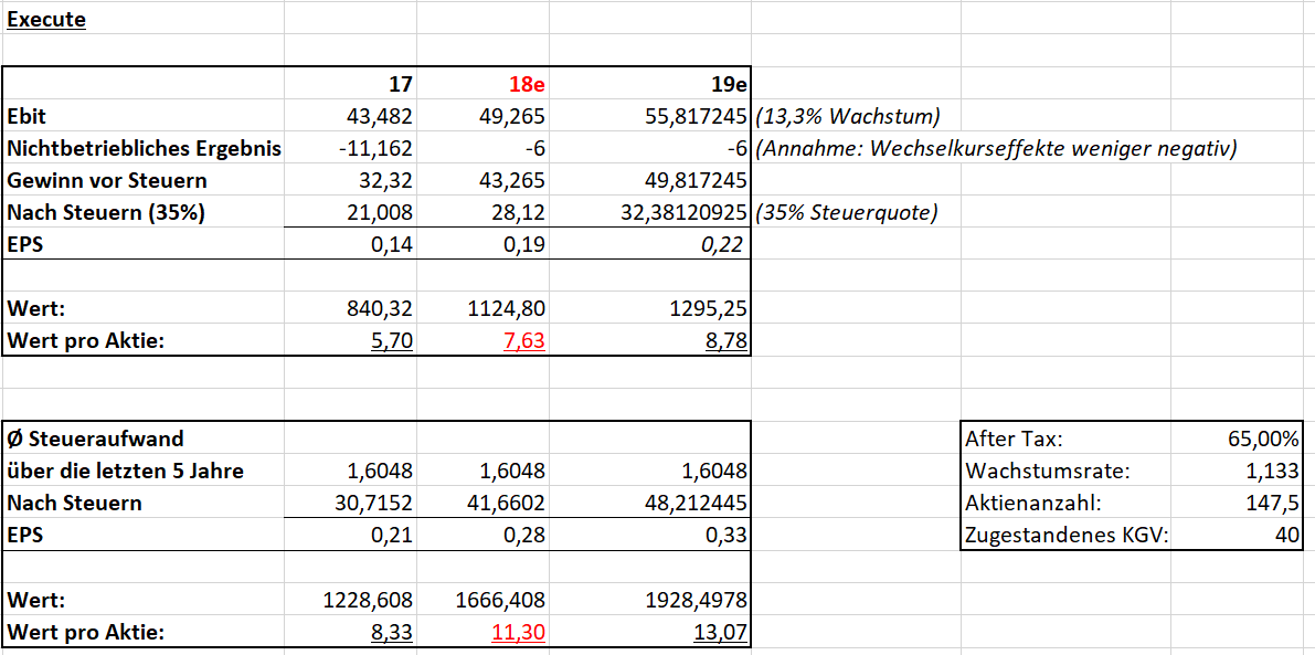 Im zweiten Teil meiner Bewertung von Evotec versuche ich Evotec anhand eines zugestandenen KGV von 40 zu bewerten. Auch hier habe ich wieder verschiedene Annahmen getroffen. Unter anderem unterstelle ich, das Execute sein operatives Ergebnis um 13,3% steigern kann. Weiterhin rechne ich damit, dass die Wechselkurse in 2018 immer noch einen negativen Einfluss haben, dieser jedoch nicht mehr ganz so stark ist wie in 2017. Außerdem habe ich wieder 2 steuerliche Szenarien berücksichtigt, einmal mit der realen Steuerquote von 35% und einmal mit einem geringeren Steueraufwand über die letzten 5 Jahre verteilt.