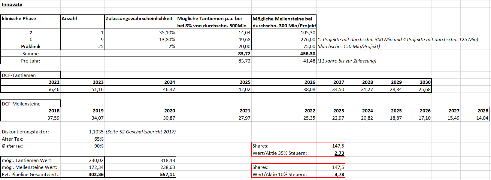 Die 50 Projekte aus der Forschung werden in diesem Modell nicht berücksichtigt, wodurch noch signifikantes Upsidepotential in der Bewertung besteht. Auch sind natürlich viele Ungenauigkeiten und Annahmen getroffen worden, weshalb der Wert nur einen ungefähren Bewertungsansatz darstellt.