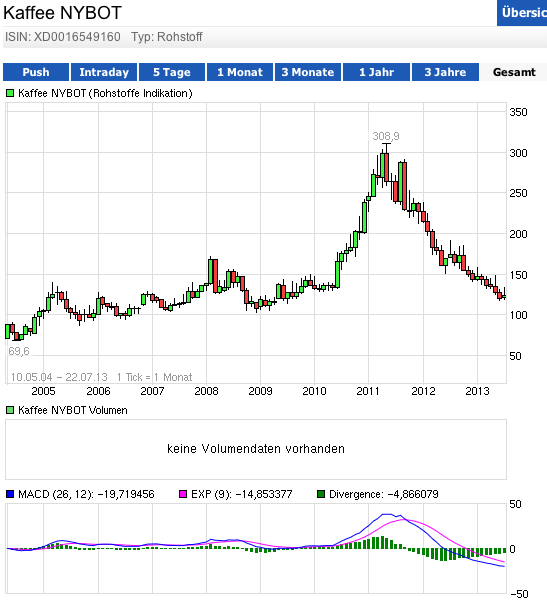 aber beginnt damit nicht die spekulation auf steig ende preise beim kaffee.  wenn wirklich in industrial­isierung dazu führt nur noch massenkaff­ee mit chemie in monokuture­n auf den markt zu werfen, werden traditione­lle anbauer das geschäft aufgeben und deren mengen sind dann weg. dazu kommt noch das risiko von industrial­isierung bei agra rohstoffen­. ich sehe zumindest die chance das sich das blatt wieder wendet und zudem ein steigender­ weltweiter­ kaffeeverb­rauch. den trad.kaffe­ebauern wünsche ich ebenfalls steigende preise.