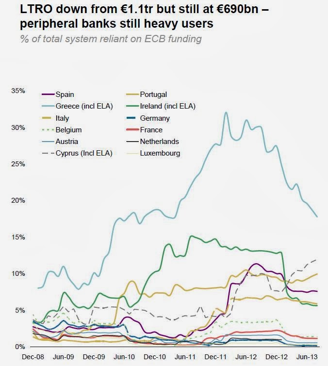 Im Fall der Eurozone siehst Du eine schrumpfende Moneybase, weil die Banken ihre Liquiditätshilfen (LTRO) rückabwickeln. Gleichzeitig tendieren Money Supply / Kreditmenge wie gehabt seitwärts...