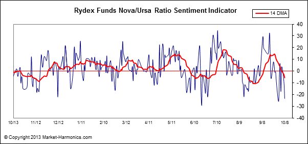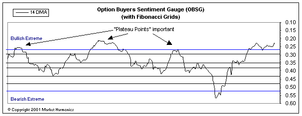 The Option Buyers Sentiment Gauge (OBSG) which I've developed applies the principles of momentum and relative strength to the daily average P/C Ratio for Equity and Index option volume. It is plotted with the Wilshire 5000 Total Market Index to relate price and sentiment trends.