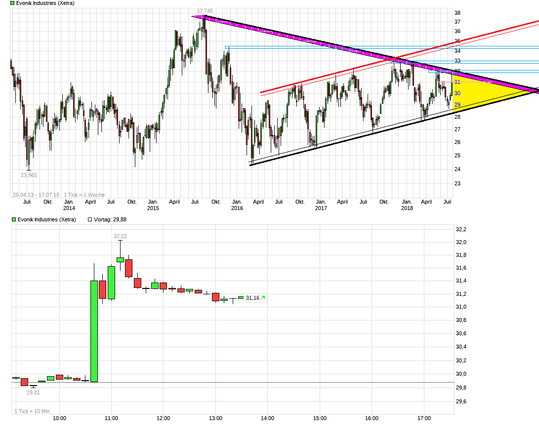 Ausbruch steht weiter auf der Wunschliste. Erstmal ist man nach dem hohen Hüpfer vorhin wieder nach unten etwas zurückgekommen Richtung 31er Marke. Da stehen natürlich auch gleich zwei dicke Marken vor der Tür (Abw.trend und horizontaler Widerstand), die erstmal geknackt werden wollen. Könnte vielleicht auch sein, daß man hier bis zum kleinen Verfallstag am Freitag möglichst keinen Anstieg erstmal will. Mal schauen, ob man sich wenigstens um die 31er Marke beim Rücklauf jetzt wieder stabil fängt. Große Prognoseanhebung beim EBITDA war es eigentlich nicht was heute verkündet wurde. Eher eine Prognoseeingrenzung im bisherigen oberen Prognosebereich mit einer homeopathische Zahl knapp darüber. Statt bisher 2,4-2,6 Mrd nun 2,6 bis 2,65 Mrd. Ob 2,6 oder 2,65 macht den Kohl auch nicht mehr fett. Von daher ist hier jetzt auch keine Wunderleistung vermeldet worden beim EBITDA. Vielleicht haben es auch größere Investoren still und heimlich so erwartet. Erfreulich die deutliche Anhebung beim FCF. Könnte somit auch bedeuten, daß die nächste Divi noch deutlicher erhöht wird. Na, schauen wir mal, ob auch der Gesamtmarkt jetzt noch mitspielt und man dann doch noch in den nächsten Wochen nach oben rauskommt bem Kurs. Unschön würde es, wenn man unter den seit Anfang 2016 steigenden Aufw.trend mal fallen würde. Läge z.Z. knapp unter 29€ . Die Spanne zwischen oben und unten wird immer geringer. Von daher muß man sich irgendwann mal entscheiden, wie man aus diesem großen Dreicke der beiden Trendlinien( Auf- u. Abw.trend) der letzten 4 Jahre rausläuft. Begrüßenswerter wäre natürlich nach oben raus :)