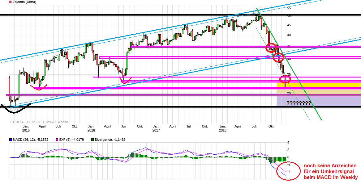 Mit dem Break unter die horizontale Unterstützung von Sommer 2016 hat sich die weiterhin völlig intakte Abwärtsbewegung nochmal weiter verschärft. Nachdem man schon vor Wochen den langjährigen Aufw.trendkanal nach unten verlassen hat, ist man nun dabei eine horizontale Unterstützung nach der anderen "abzugrasen". Die Geschäftszahlen von Zalando sind ja immer wieder wenig erbaulich und das Gesamtumfeld der Börse ist ja auch so, daß ähnlich wie Ende der 90er Jahre die ganzen hochgespülten Dot.Com Firmen im Abschwung dann stets am meisten einbüßen. Da man wohl mit hoher Wahrscheinlichkeit davon ausgehen kann, daß in 2019 die Börsen nochmal die Tiefs von 2018 unterschreiten, werden also wahrscheinlich die ganzen "Schönwetter"-Aktien noch weiter underperformen. Könnte vielleicht ein Pullback geben an die heute durchbrochene Unterstützung, aber vermutlich wäre das nur Rücklauf, wo Shorties dann erneut die Chance sehen einzusteigen. Solange hier also die übergeordnete Abwärtsbewegung/der Abwärtstrend nicht nach oben durchbrochen wird, der MACD nicht wenigstens wieder ansatzweise Kaufsignale zeigt und die Gesamtbörse auch keine Bodenbildung vorweisen kann, sehe ich hier die nicht geringe Gefahr, daß man sich schubweise weiter Richtung der 17er Marke bewegen wird. Sind vom aktuellen Kurs ja auch nur etwas über 4€ die dafür noch fehlen. Das ist also kein Strecke die sonderlich weit weg wäre. Und wenn es Leerverkäufern dann sogar gelingen sollte die Aktie unter 17€ zu drücken, dann könnte es da nochmal richtig rappeln.
