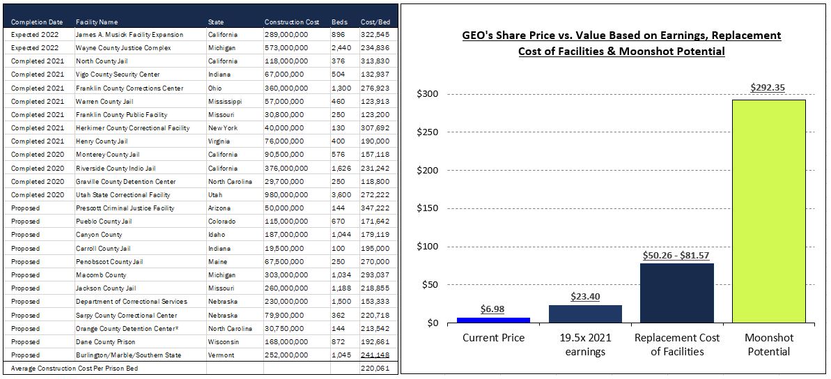 What is GEO worth? 1. Earnings: We already knew GEO is dirt cheap, trading at only 5.8x 2021 earnings. Meanwhile, the average company in the Russell 1000 Index trades at 19.5x. Apply that 19.5x multiple to GEO’s earnings of $1.20 per share and you get a $23.40 share price. 2. Real Estate/Replacement Cost: Now we also know that the replacement cost of GEO’s facilities, less liabilities, is an absolute minimum of $50.26 per share.