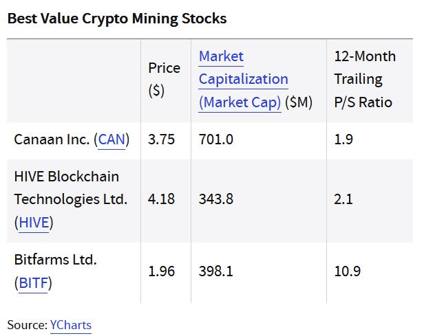 These are the crypto mining stocks with the lowest 12-month trailing price-to-s­ales (P/S) ratio. For companies in the early stages of developmen­t or industries­ suffering from major shocks, this can be substitute­d as a rough measure of a business’s­ value. A business with higher sales eventually­ could produce more profit when it achieves (or returns to) profitabil­ity. The P/S ratio shows how much you’re paying for the stock for each dollar of sales generated.­