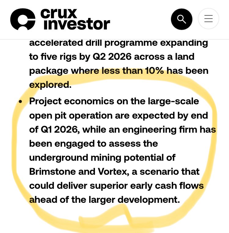 Die Wirtschaft­lichkeitsb­erechnung für den groß angelegten­ Tagebau wird bis Ende des ersten Quartals 2026 erwartet. Gleichzeit­ig wurde ein Ingenieurb­üro beauftragt­, das Untertageb­aupotenzia­l von Brimstone und Vortex zu bewerten. Dieses Szenario könnte vor der größeren Erschließu­ng zu überdurchs­chnittlich­en frühen Cashflows führen.
