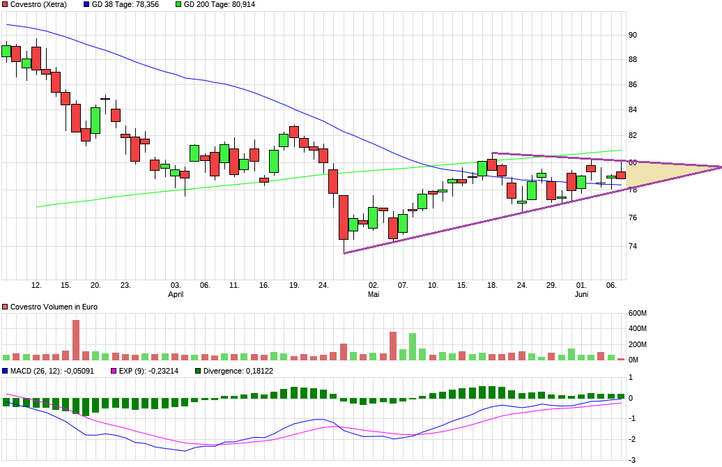 Hält sich der DAX oberhalb 12600, sollte Covestro demnächst die 80-81 € überwinden und dann Platz bis zu den Hochs haben. Könnte allerdings bis in den Spätherbst hinein dauern bis man die Hochs wiedersieht.