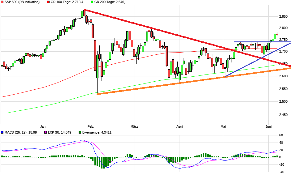 Im Übrigen hab ich selten so technisch stark bullishe Indizes im Juni gesehen. Vor allem Dow Jones und S&P500 sehen extrem bullish aus. Sieht stark nach einer beginnenden Sommerrallye aus. Kann man als deutscher Anleger nur hoffen, dass der Euro keinen Strich durch die Rechnung macht, was den Dax betrifft.
