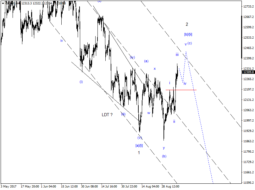 Höchstwahrscheinlich bildet sich die Welle (c) of 2 Alt. [b]/[ii] als Impuls aus. Deswegen auch änderung der Zählung, Welle i Impuls Welle ii Running Flat Welle iii Impuls Welle iv wird erwartet als ZZ oder Triangle Welle v muss ein Impuls sein oder EDT Ziel der Welle 2 ca.12487