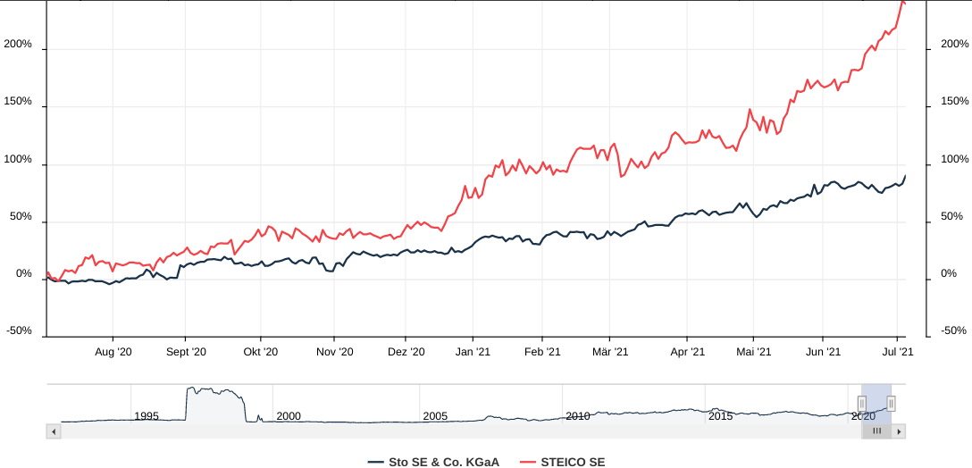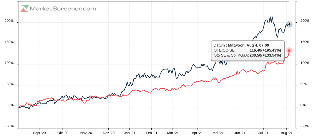 ... aber die überteuerte aktie von STEICO SE (jetzt kurs 118,4, kgv2021e =42x [3 analysten]) treibt die viel "billigere" aktie der STO SE & CO. KGAA (jetzt kurs 191,6, kgv2021e =17,1x [1 analyst]) vor sich her