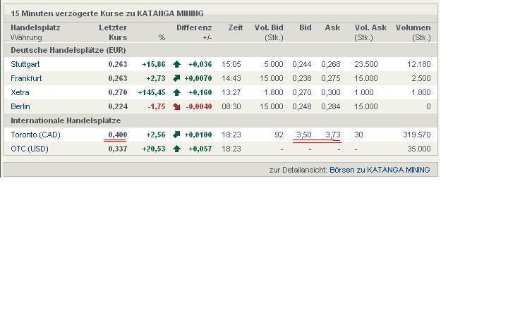Außerdem ist das ja echt ein Witz, Katanga die 2007 noch ein Börsenliebling waren mit einem geschätzten Wert von 3,3 Milliarden Dollar und die die Aussicht haben gemäß Berechnungen der Experten bis 2011 der grösste Kupferproduzent Afrikas und der grösste Kobaltproduzent der Welt sein können, jetzt für ein paar hundert Millionen vielleicht den Besitzer wechselt, ist doch total gaga... und wenn das wirklich eintrifft ist die Frage, ob die Katanga Aktie überhaupt noch steigt oder ganz zusammenbricht,... oder die restlichen Aktionäre noch ein Can Dollar für die Aktie bekommen. Naja meine Meinung...
