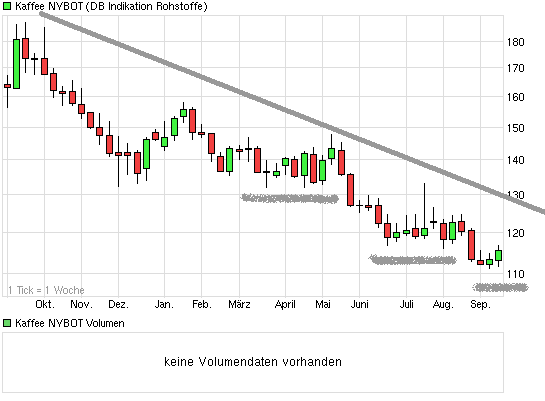 Hätte mich vor ein paar Wochen auch beinahe vom bullishen Hipe zu Kaffee hier anstecken lassen. Habe mich aber zum Glück noch selber informiert. Bei der derzeitigen Situation (aktuelle Ernten, Lagerbestände, fallender Real, Erwartungen für 2013 als starkes Jahr im Erntezyklus) sehe ich aktuell keinen Grund für eine Trendumkehr und stelle eher mal in Frage, dass man hier Chart-Technik handeln sollte. Wenn einer Gründe kennt, warum's rauf gehen sollte, dann würde ich die gerne erfahren.
