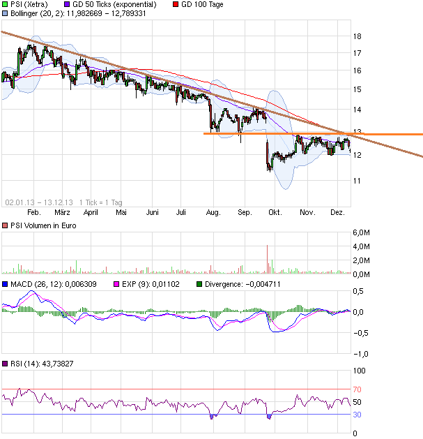 Im jüngsten Interview bemüht Schrimpf wieder die 'Energiewende' als besonderen Kostenfaktor, die auch wieder als Entschuldigung für schlechte Zahlen herhalten muss, wo er im Frühjahr noch beschwichtigte, der Energiesektor mache nur ein Bruchteil der Aktivitäten von PSI aus. In diesem Jahr hat er so herumgeeiert, dass es mich wundert, dass er noch ausreichend Glaubwürdigkeit besitzt. Wir sind aber auch schon deutlich heruntergekommen und die einen meinen, die 10 könne fallen, andere denken die Zeit sei langsam reif etwas damit zu wagen. Ich denke, dass diejenigen, die schon drin sind jetzt nicht grade aussteigen sollten.
