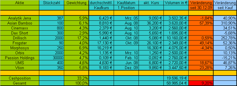 @Carter, ich werd wohl erst frühestens Ende nächster Woche dazu kommen, da ich Freitag früh auf Festival fahre und erst ab nächsten Mittwoch wieder Zeit dafür finden würde. Zudem stehen noch 2-3 Kauforders aus, die vielleicht bis Ende nächster Woche bedient werden. Da ändert sich das Depot also sowieso noch.