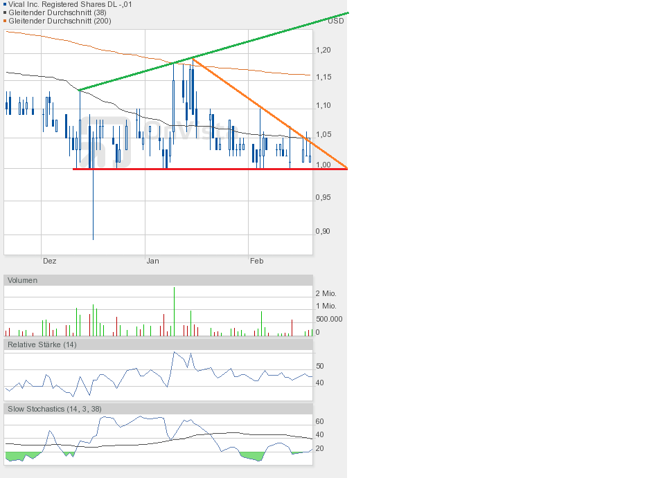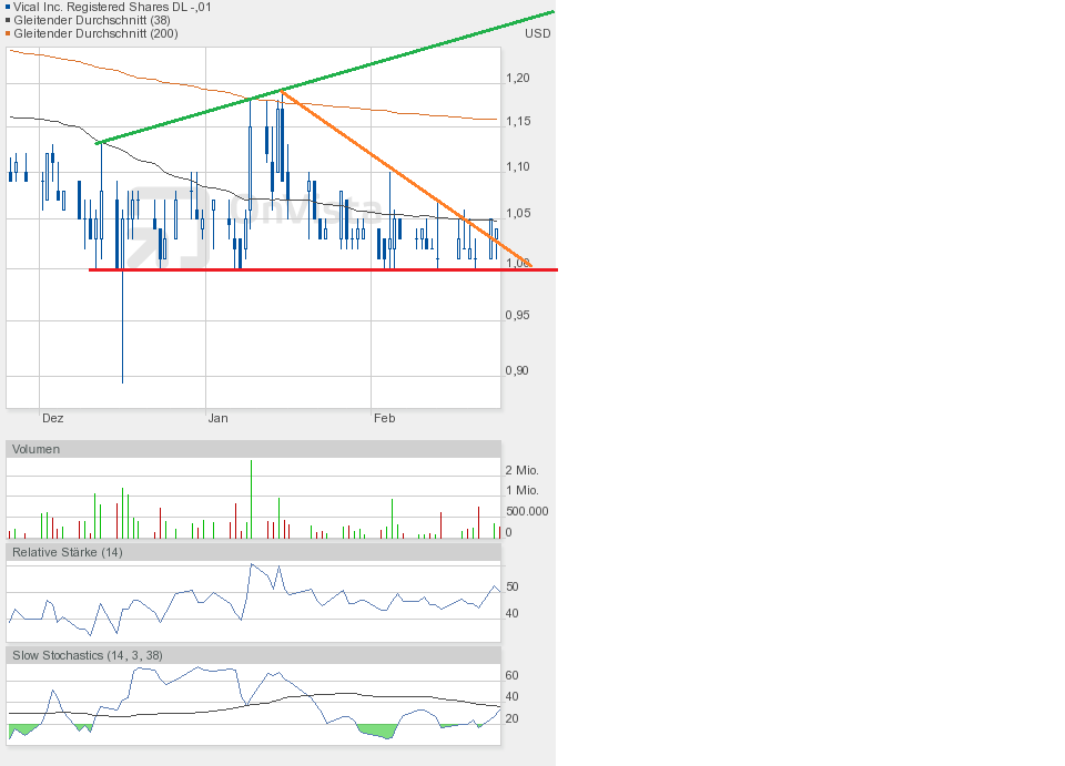 Mit 1,05$ im Hoch wurde gestern die orangene Abwärtstrendlinie erreicht. Schlusskurs 1,03$.