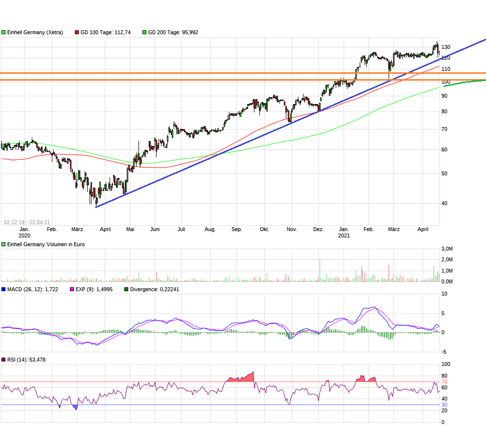Ich hätte mir allerdings gewünscht, dass er den Chart mal etwas mehr aufzieht und zudem in die Log-Einstellung geht. Dann hätte man die übergeordnet höheren Hochs gesehen, die ich für sehr wichtig halte. Wobei das letztlich auch zu seiner eigenen Grundaussage passt, dass man übergeordnet bullish aussieht, aber einen Rückgang bis 102-107 € etwa nicht ausschließen kann, aber solange man über 119 € liegt, die Sache an sich sogar sehr bullish aussieht. Allerdings muss man halt mal abwarten, welche Formation sich jetzt kurzfristig ergibt, also gehts unter 119 € oder über die Hochs bei 134 €. Dazwischen ist fundamental und technisch eigentlich Niemansland.